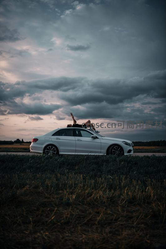 一辆白色轿车停在乡间小路旁,一人惬意地躺在车顶,双臂张开拥抱天空。背景是壮丽的晚霞与厚重云层,前景是金黄的麦田,画面充满自由与浪漫气息。