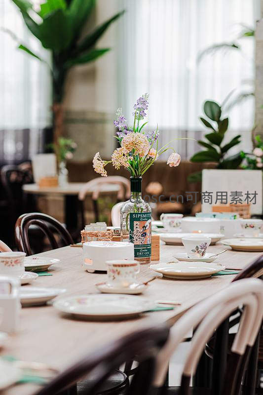 一张长木桌精心布置着花纹瓷器、玻璃酒瓶与插有淡紫色花朵的花瓶,背景是绿植环绕的明亮空间。整体色调柔和,氛围宁静优雅,适合下午茶或小型聚会场景。