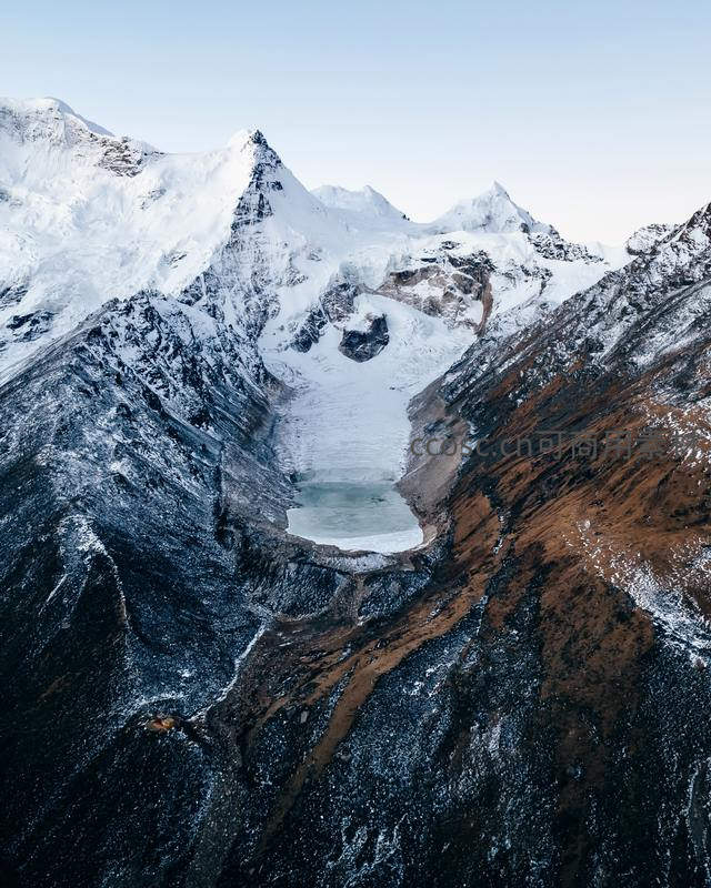 从高空俯瞰,巍峨雪山环抱一汪碧绿冰湖,冰川与裸露山岩交织,展现地球最原始的壮美与宁静。