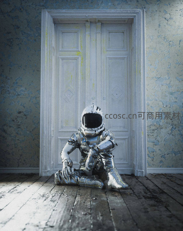一个穿着闪亮银色宇航服的人蜷缩在斑驳墙壁与老式白门前的木地板上,氛围静谧而充满故事感,似在等待或回忆。