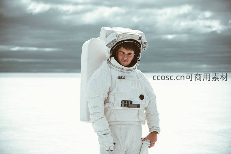 一位面带微笑的宇航员站在广袤无垠的白色荒原上,头顶乌云密布,他仿佛正准备踏上未知的旅程,充满希望与勇气。