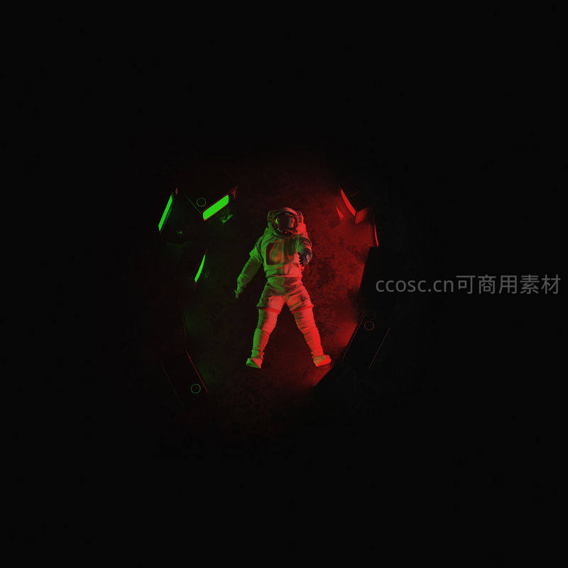 在漆黑的空间里,宇航员被红绿霓虹灯光环绕,科技感十足,仿佛置身于虚拟现实或赛博空间,充满神秘与未来气息。