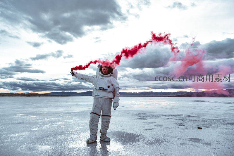 身着白色宇航服的人物伫立在广袤冰原上,手持红色烟雾弹划破灰云密布的天空,象征人类在极端环境中的求救与探索精神。