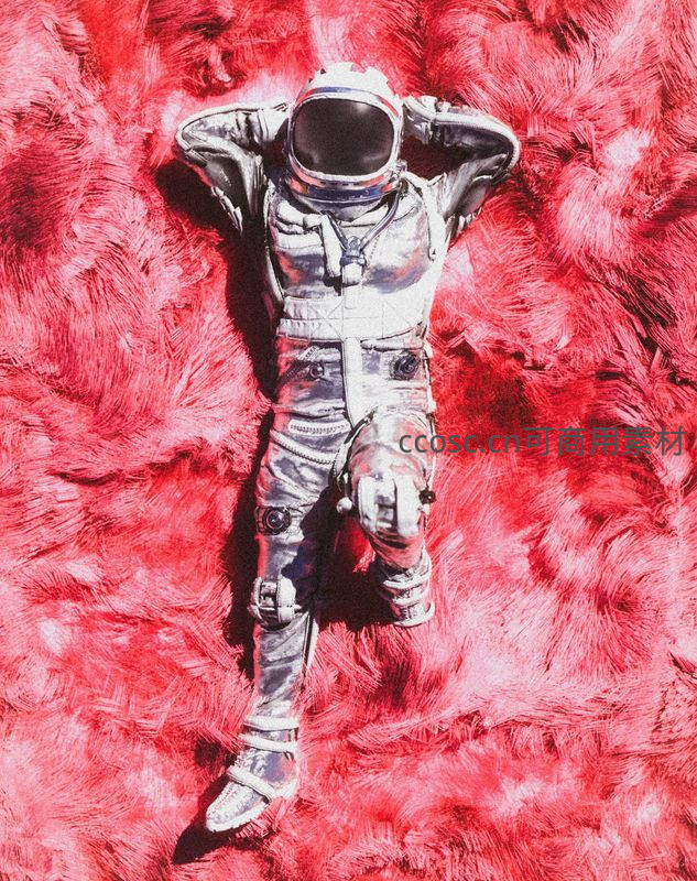 宇航员躺卧于鲜红绒毛地毯上,形成强烈视觉反差