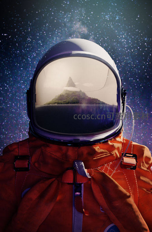 在璀璨星河的背景下,宇航员头盔的面罩上清晰倒映出一座被云雾环绕的绿色岛屿,营造出超现实的科幻意境,象征着对未知世界的向往。