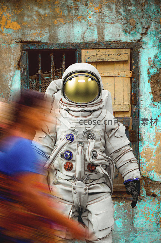 一名身着白色宇航服的宇航员静立于色彩剥落的复古墙壁前,前景有动态模糊的人影掠过,营造出时空交错的超现实感。