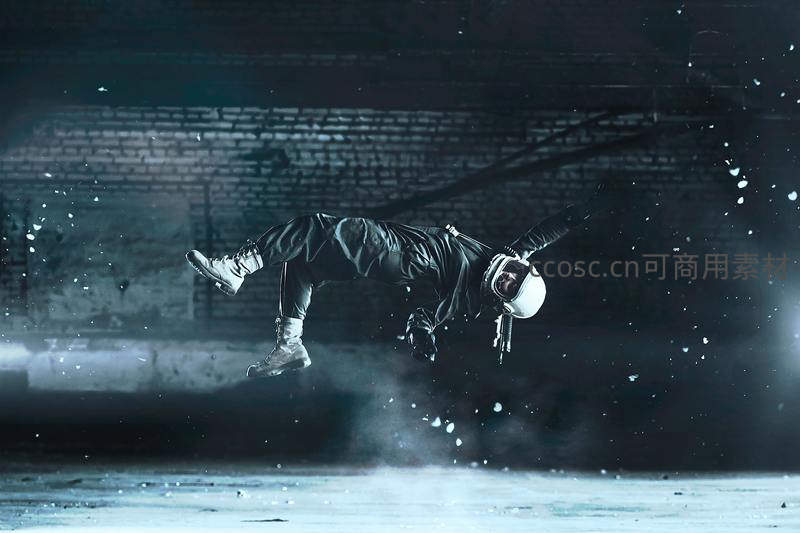 一名宇航员在布满砖墙与飘雪的工业环境中悬浮半空,营造出太空失重的错觉,画面充满动感与神秘科幻色彩。