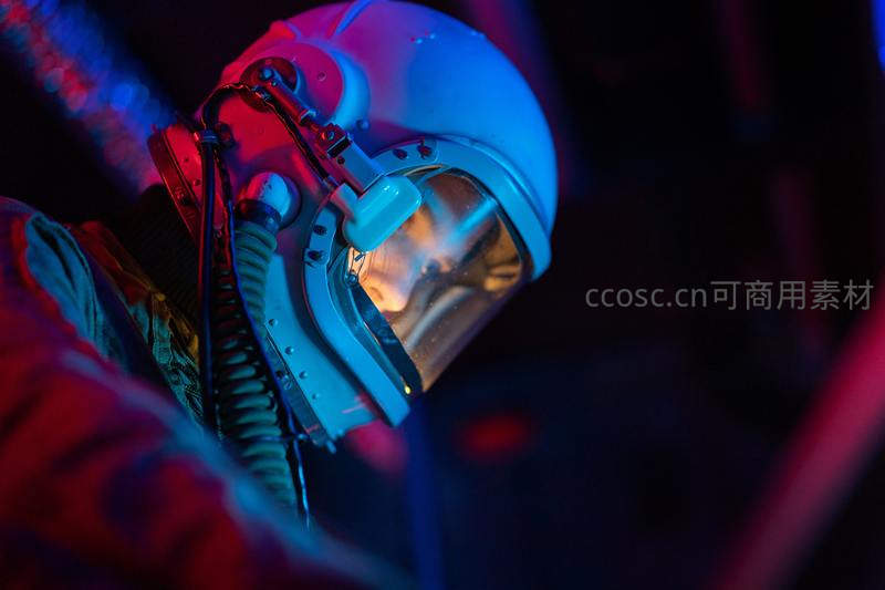 在红蓝霓虹灯光的映衬下,宇航员头盔的细节被清晰展现,面罩反射出神秘光芒,营造出强烈的科幻氛围与未来感。