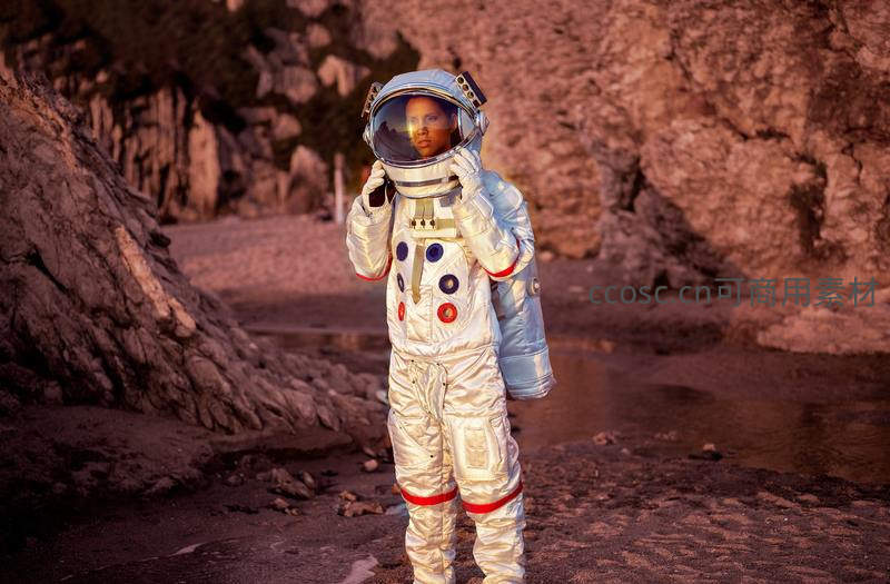 一名宇航员站在红色岩石峡谷中,夕阳余晖洒在白色太空服上,仿佛置身异星地貌,展现出人类探索未知世界的孤独与壮美。