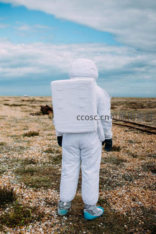 一名宇航员背对镜头,背着背包站在开阔的荒野上,仰望蓝天白云,象征着人类对浩瀚宇宙永恒不息的探索精神。