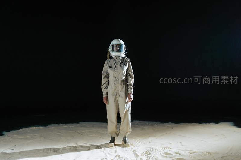 孤独宇航员伫立在模拟月球表面的聚光灯下