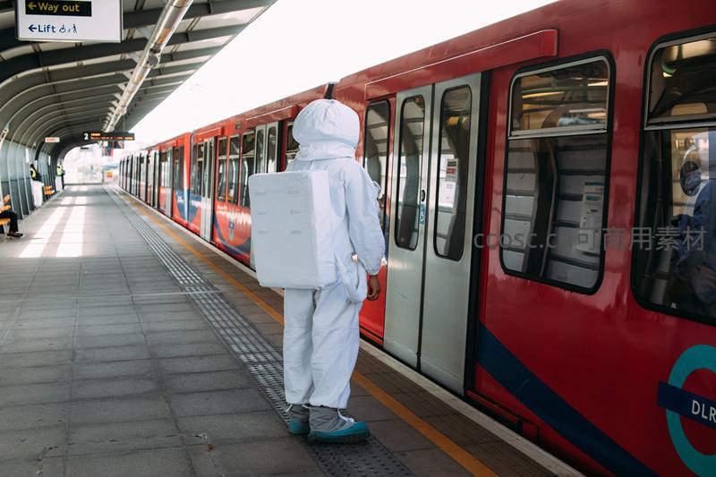 一位身穿白色防护服、背着方形设备的人站在地铁站台边,红色列车停靠在旁,场景反映疫情期间城市公共交通中的特殊防护措施与日常秩序。