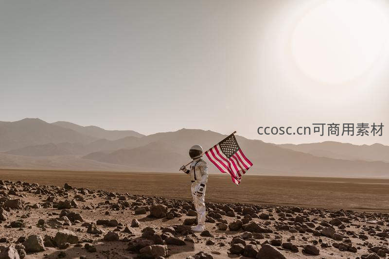 宇航员在火星地貌中挥舞美国国旗