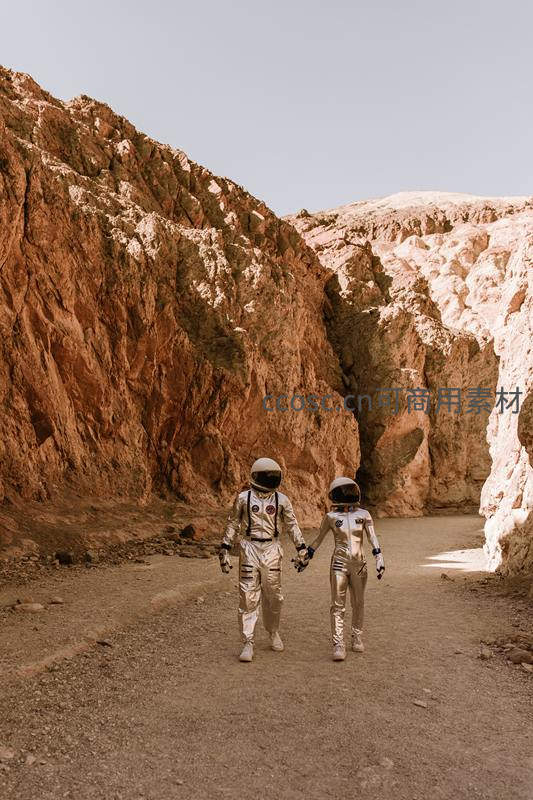 情侣宇航员牵手漫步峡谷