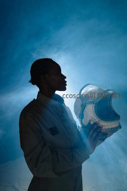 人物侧身托举宇航头盔,逆光下轮廓分明,蓝色烟雾弥漫背景,营造神秘梦幻的太空意境,表达对星辰大海的向往与敬畏。