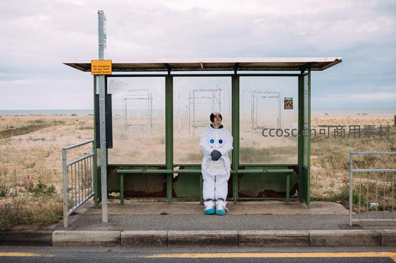 一名身着白色宇航服的人物独自坐在海边荒芜的公交站台,背景是空旷的沙地与大海,呈现出强烈的超现实与孤独感。