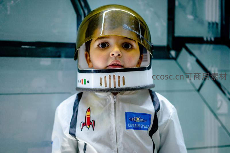 孩童身穿太空服好奇仰望镜头