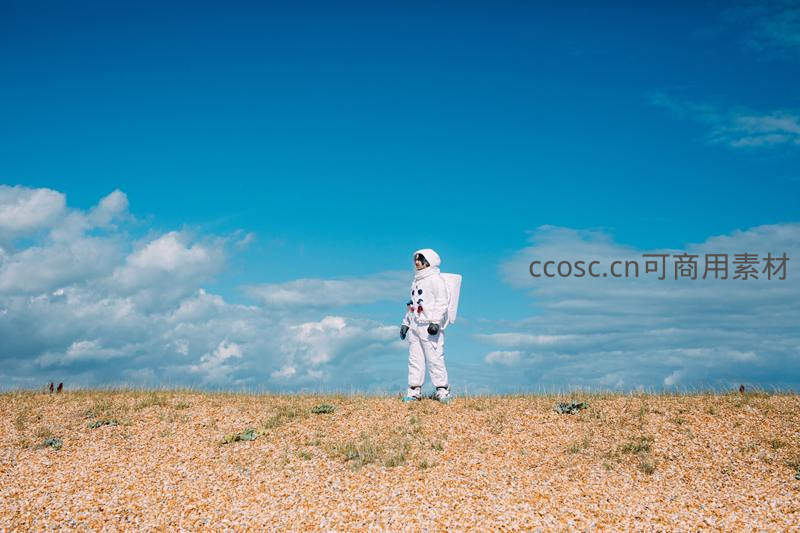 宇航员独自伫立海岸鹅卵石滩上