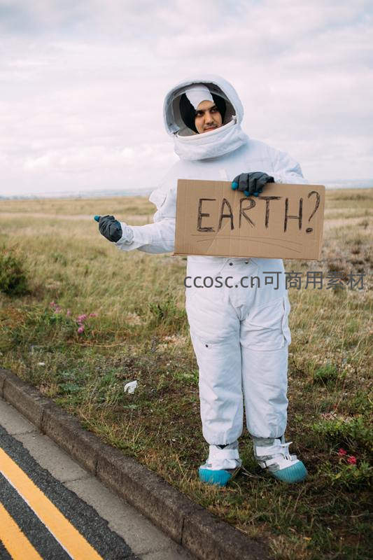 一位身着白色宇航服的人站在公路边草地上,手持写有“EARTH?”的纸板,表情略带困惑,巧妙地将太空探索与地球环境议题结合,引发思考。
