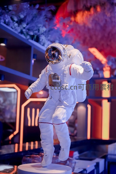 一个精致的宇航员模型置于圆形展台上,背景是蓝红交织的霓虹灯光与模糊的植物装饰,整体氛围充满未来科技感与艺术气息。