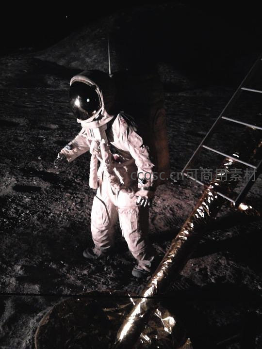 一名宇航员身着厚重太空服,站在布满陨石坑的月球表面,身旁是登月舱的梯子,在漆黑宇宙背景下进行人类首次地外天体探索。