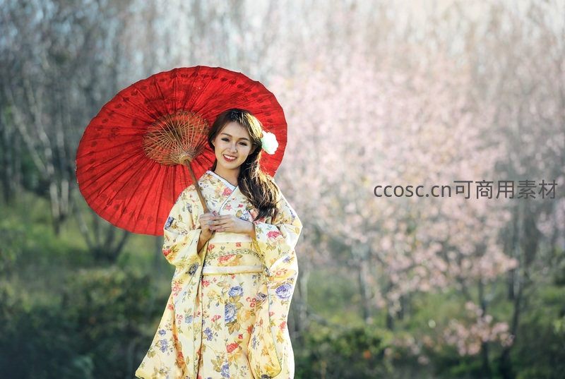 一位身着花色和服的年轻女子,在盛开的樱花树下撑着一把鲜艳的红色油纸伞,面带甜美笑容,背景虚化营造出梦幻氛围。