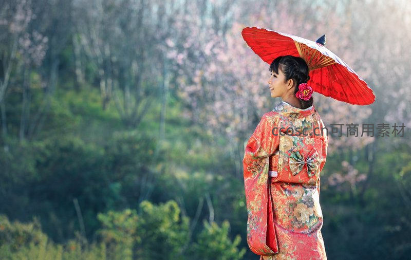 红伞和服少女赏樱侧影