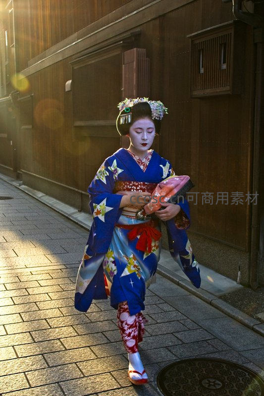 蓝底星纹和服女子漫步古街
