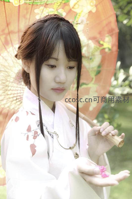白衣少女手持花伞凝视花瓣