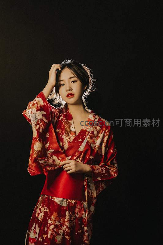 深色背景下,一位女子身着华丽红色和服,姿态慵懒而自信,光影勾勒出她精致的轮廓与服饰纹理,营造出神秘又高贵的氛围。