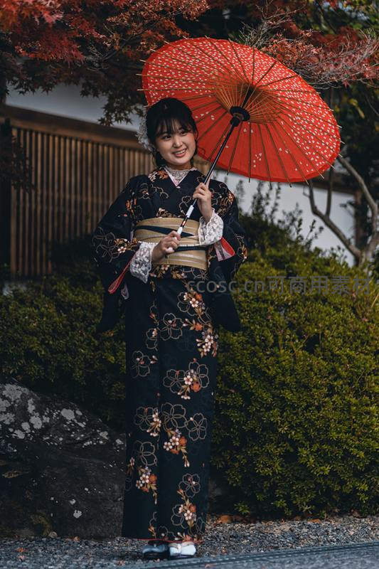 秋日庭院,黑底和服配红伞