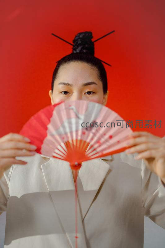 一位盘起发髻的女子以红色折扇半遮面容,仅露出专注的眼神,身着素雅白衣,在纯红背景下营造出强烈的视觉对比。
