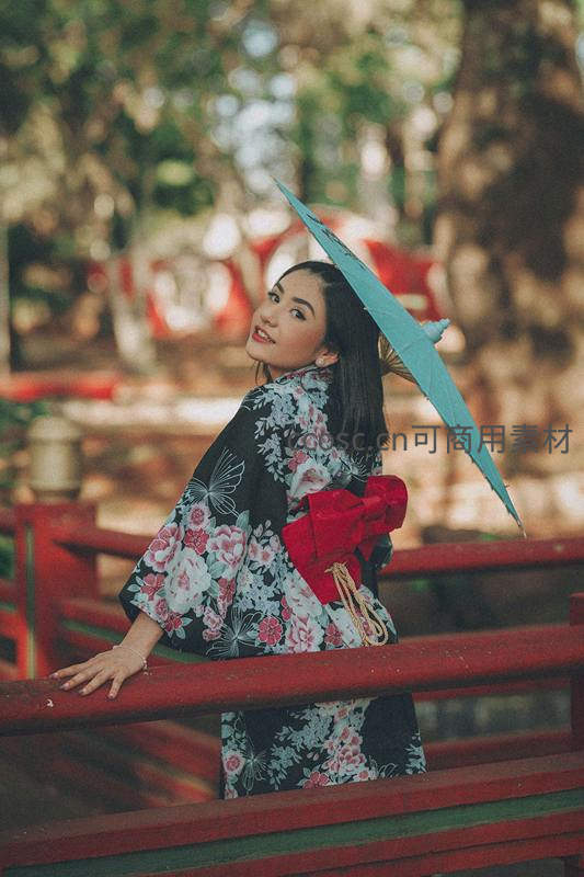 身着黑底繁花和服的女子手撑青色油纸伞,倚靠红色木桥栏杆回眸一笑,背景绿意盎然,尽显日式庭院的诗意与浪漫。