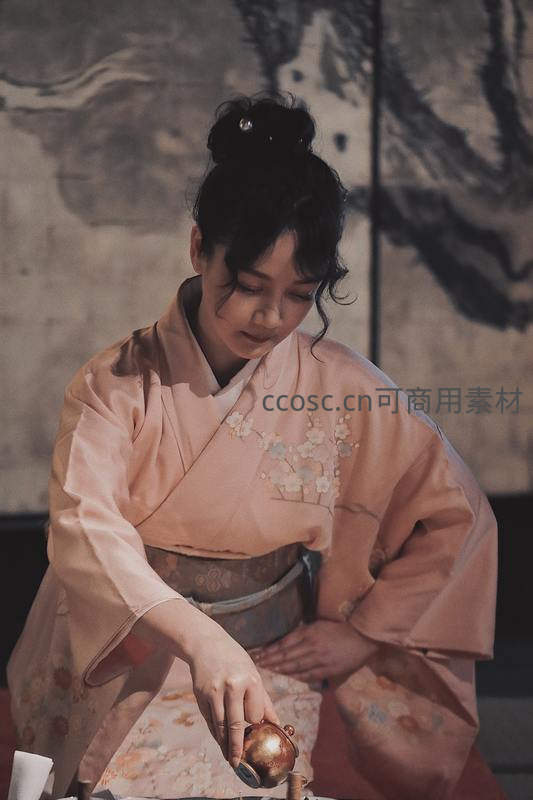 身穿淡粉色樱花和服的女子正低头专注地进行茶道仪式,背景水墨画增添禅意,体现日本传统文化的宁静与雅致。