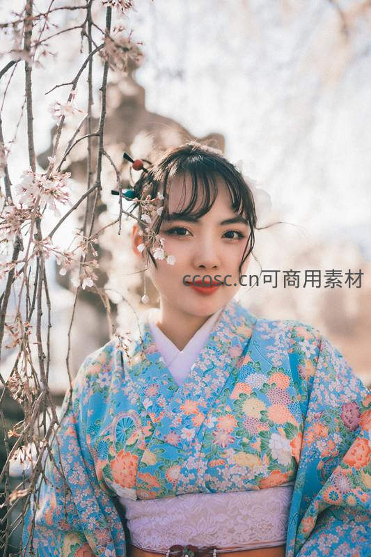 阳光透过盛开的樱花枝头洒落在身着华丽和服的女子身上,她温柔微笑,与春日美景融为一体,尽显柔美与生机。