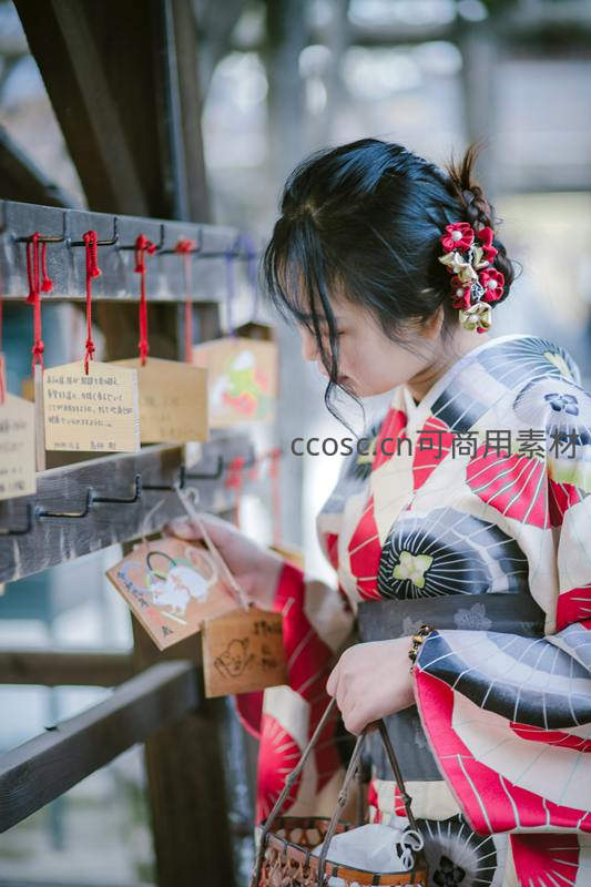 一位穿着传统和服的女子在神社前虔诚地挂上绘马,发间点缀花朵,神情专注,传递出对美好生活的祈愿与宁静心境。