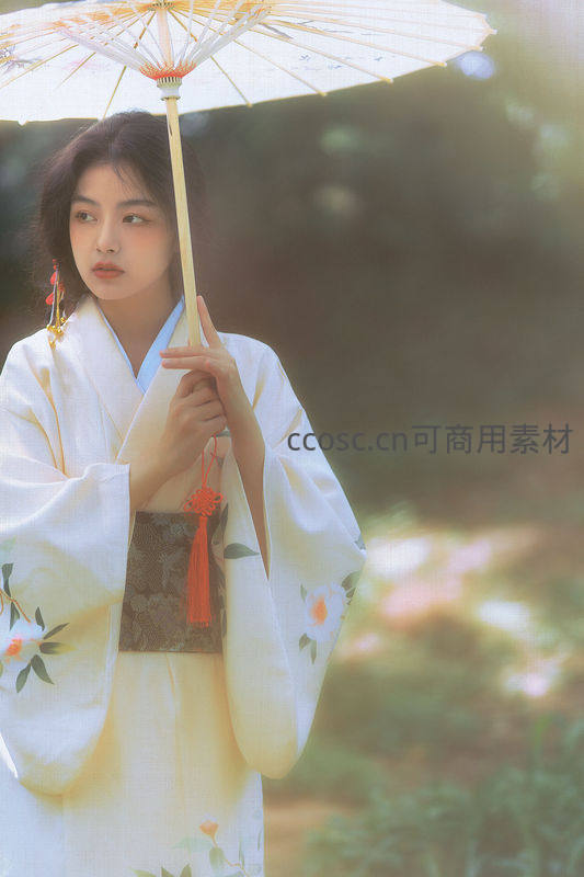 身着素雅和服的少女手持传统油纸伞,在阳光斑驳的林间小径上静立,营造出宁静而诗意的东方古典意境。