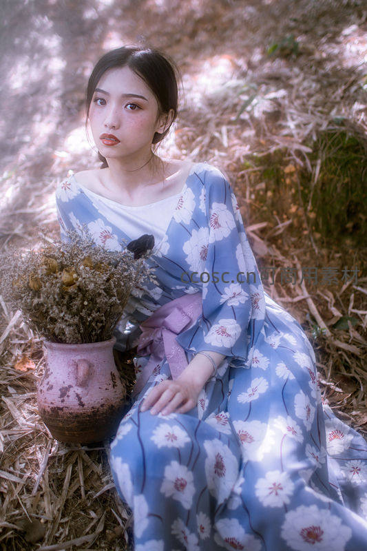 少女身着蓝色印花和服,静坐于林间枯草之上,身旁陶罐盛放干花,阳光穿过树隙洒落,画面温柔而富有文艺气息。