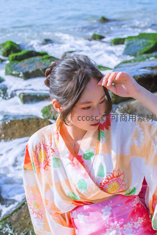 海边岩石上和服少女凝望远方