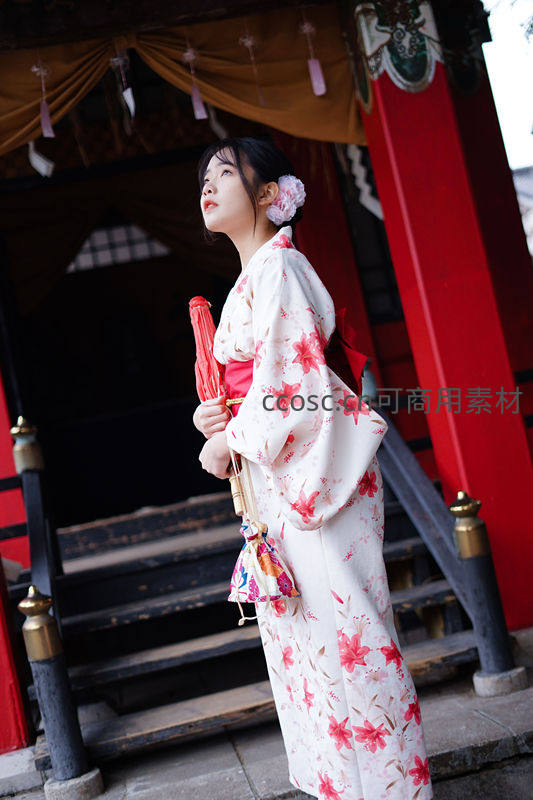 一位身着白底红花和服的年轻女子,站在朱红色的传统日式建筑前,手持一把红色油纸伞,侧脸仰望,发间点缀着粉色花朵,充满古典韵味。