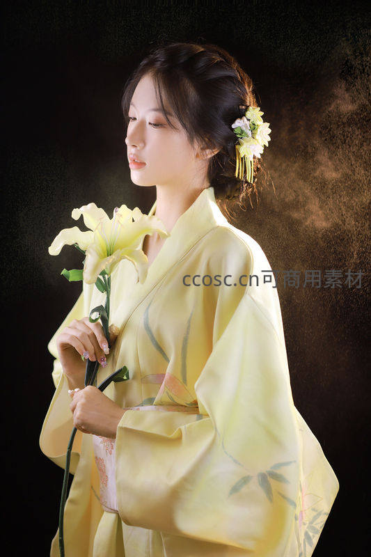 在昏暗的背景下,一位身穿淡黄色和服的女子手持一支洁白的百合花,柔和的逆光勾勒出她的轮廓,发间点缀小花,整体氛围神秘、高贵且富有艺术感。