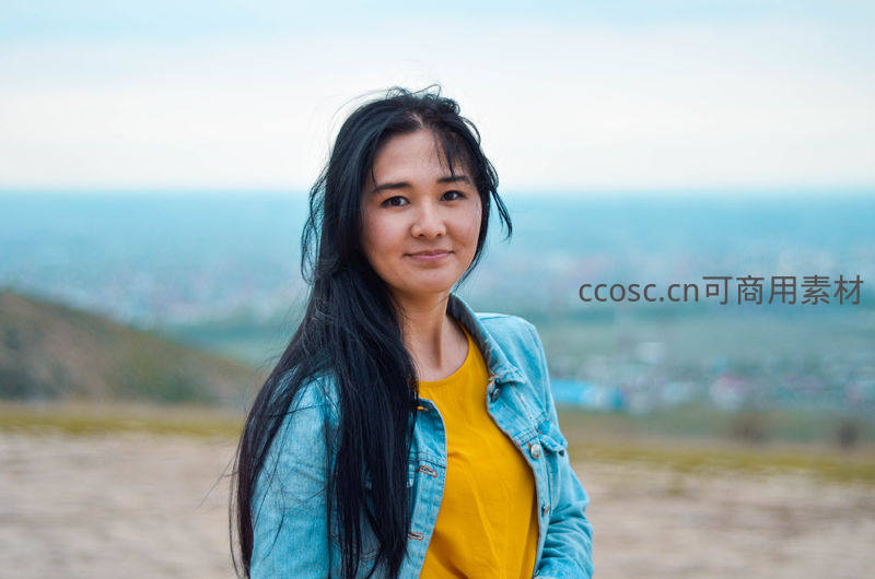 一位长发女子站在山丘上,身穿牛仔外套与黄色内搭,面带温柔微笑望向镜头,身后是朦胧的城市轮廓,展现都市与自然交融的惬意生活。