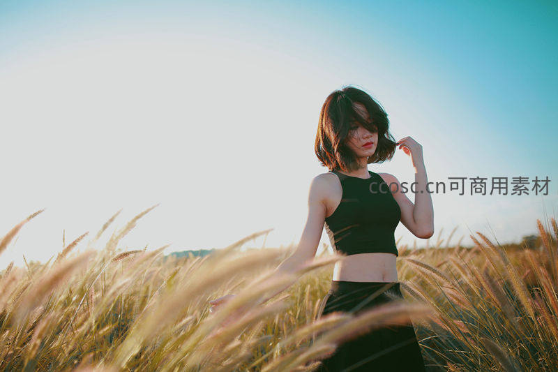 少女身着黑色露脐装伫立金黄麦浪之中,逆光勾勒柔美轮廓,微风轻拂发丝,画面静谧而富有诗意,展现自然与人的和谐之美。
