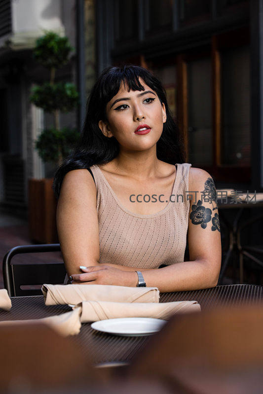 一位手臂带有精致纹身的女性坐在户外咖啡馆,神情若有所思,桌上摆放整齐餐具,环境现代雅致,展现都市女性独立自信的生活态度。