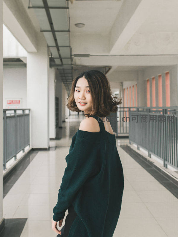 一位短发少女穿着露肩毛衣站在现代建筑走廊中,回头微笑,简洁的空间与她的温柔表情形成温馨对比。