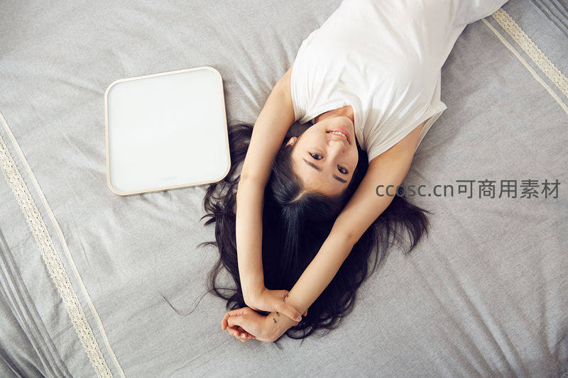 一位女子躺在整洁的灰色床单上,双臂伸展,面带微笑,身旁放着一个电子体重秤,展现轻松惬意的居家生活瞬间。