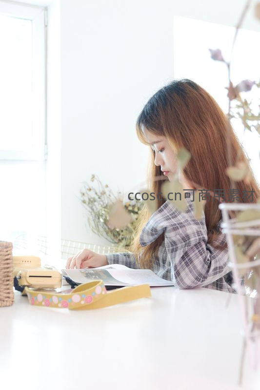 一位长发少女坐在明亮的窗边,身穿格子衬衫,低头专注地翻阅书籍,桌上摆放着小物件和干花,营造出宁静而文艺的氛围。