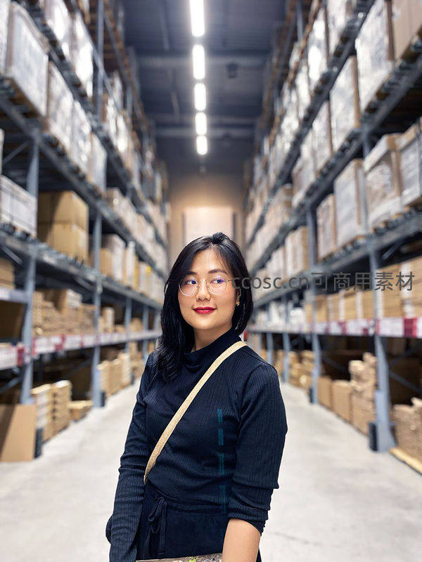 一位戴眼镜的职业女性站在高耸的货架通道中,面带微笑,展现了现代物流行业从业者专业而从容的形象。