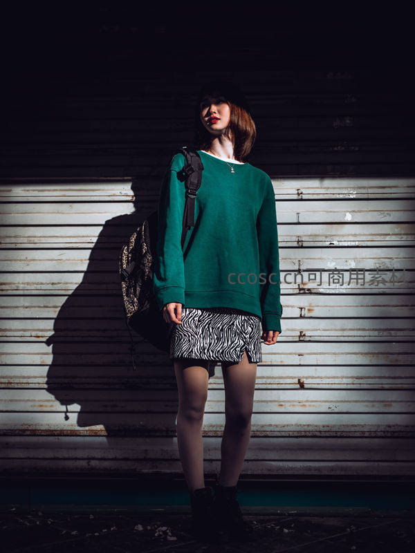 一位身着绿色卫衣和斑马纹短裙的少女,在卷帘门前摆出时尚造型,强烈的明暗对比营造出戏剧性的街头氛围。