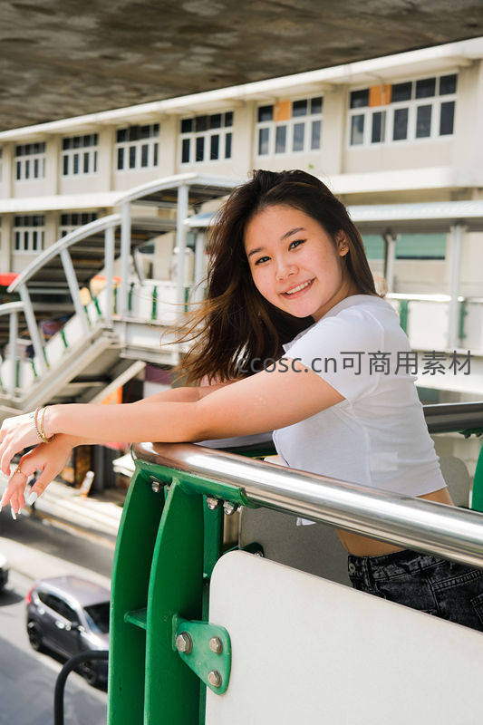 女孩倚靠在城市天桥栏杆上,微风吹拂发丝,背景是现代建筑与车流,展现都市生活的轻松与活力。